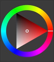 But we can model colour in other ways too. In some models, we reference the hue (base colour tone, e.g. orange, blue, etc.) directly. Image 1 shows the colour wheel from GIMP and gives us an idea of how this works. Looking at the outer ring, we can see we can specify any colour we need by referencing its degree of rotation; red is at 0, green at 120, and blue at 240. (Black, white, and the greys between are a special case and can be achieved via other parameters).