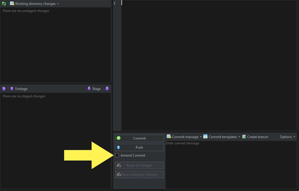 The easiest commit to modify is the most recent one. There have been plenty of times where I’ve hit the Commit button only to realise that I’ve committed more than I intended to. Image 1 shows the UI for making commits in Git Extensions. I’ve highlighted a checkbox with an arrow: when this is checked, any staged changes will be melded into the previous commit. The process would look like this: