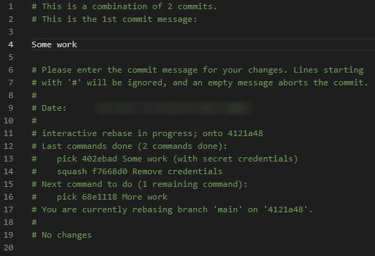 Image 6 shows the results of our interactive rebase. The commit history looks like that of the original repository state. However, commits 402ebad and f7668d0 have been rewritten as a new commit 7c21822, which no longer includes the credentials.