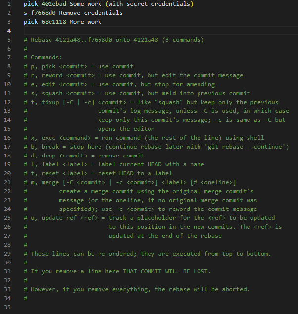 git rebase -i HEAD~3As described in the on-screen notes, we are free to re-order the commits; they will be performed in the order that they appear in the list. Let’s move the commit that removes the credentials (f7668d0) so that it gets applied immediately after where our passwords were added (402ebad). Then, let’s change the command for commit f7668d0 to s (or squash). The commit will be squashed into the previous one, effectively erasing the credentials. The command list will look like Image 4.