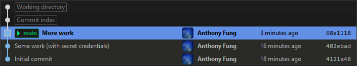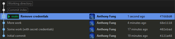 We have a commit (402ebad) that has secret credentials included by accident. We can’t amend the commit as we did above because it isn’t the most recent one on the branch. Instead, let’s remove the credentials and commit that change. Our repository will look like Image 3.
